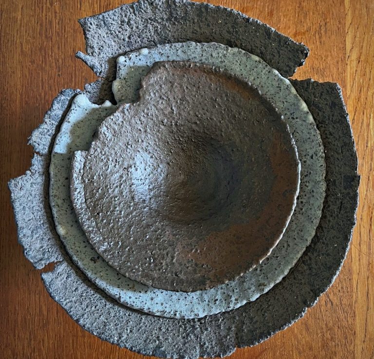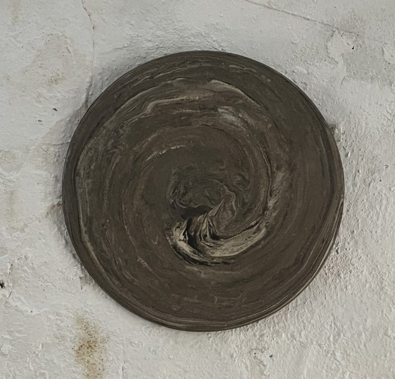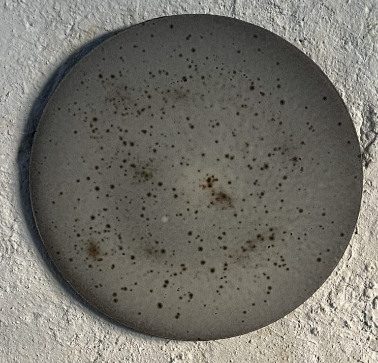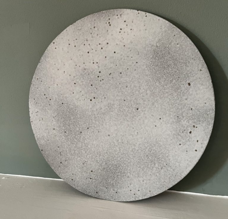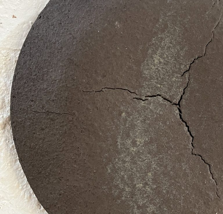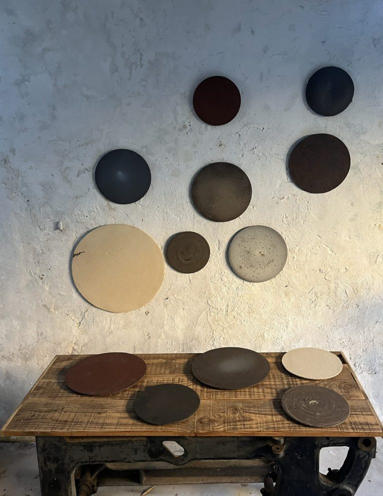 Les disques sont réalisés à la main, au tour de potier ou à la crouteuse, en grès ou mélange de plusieurs grès de teintes différentes. Ils peuvent être laissés bruts ou travaillés avec une adjonction d'agrégats minéraux ou encore être recouvert d'émail formulé par mes soins.