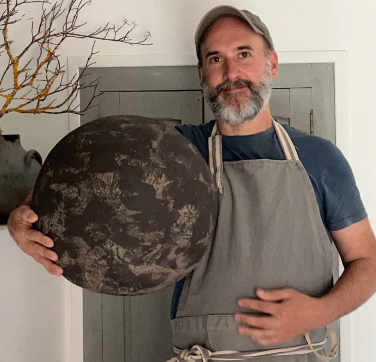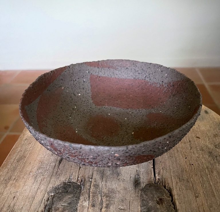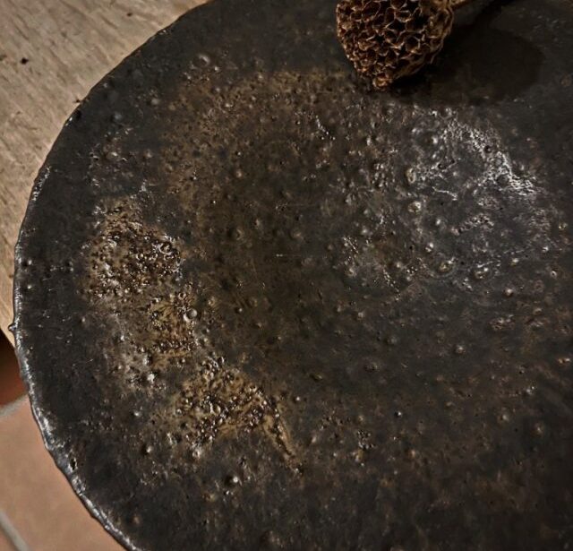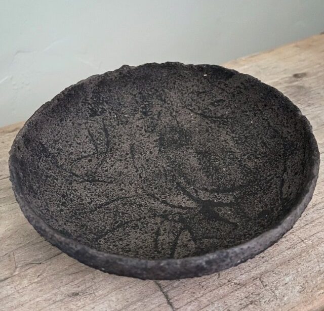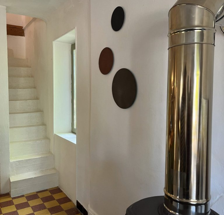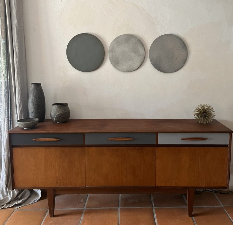 Les disques sont réalisés à la main, au tour de potier ou à la crouteuse, en grès ou mélange de plusieurs grès de teintes différentes. Ils peuvent être laissés bruts ou travaillés avec une adjonction d'agrégats minéraux ou encore être recouvert d'émail formulé par mes soins.