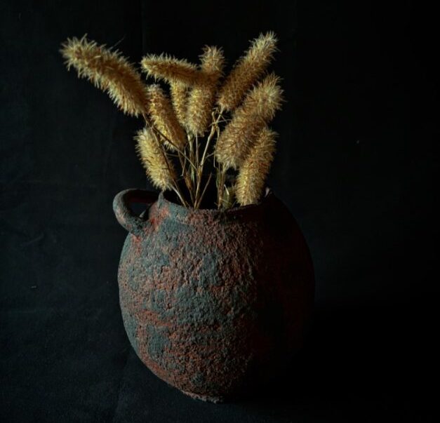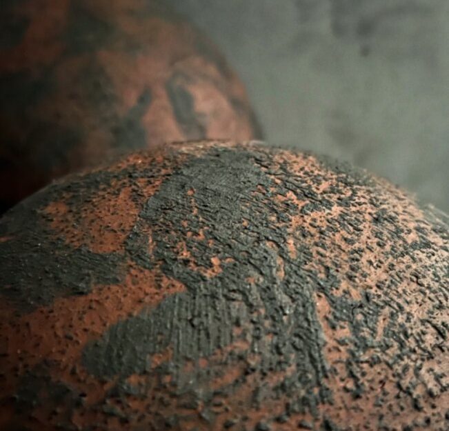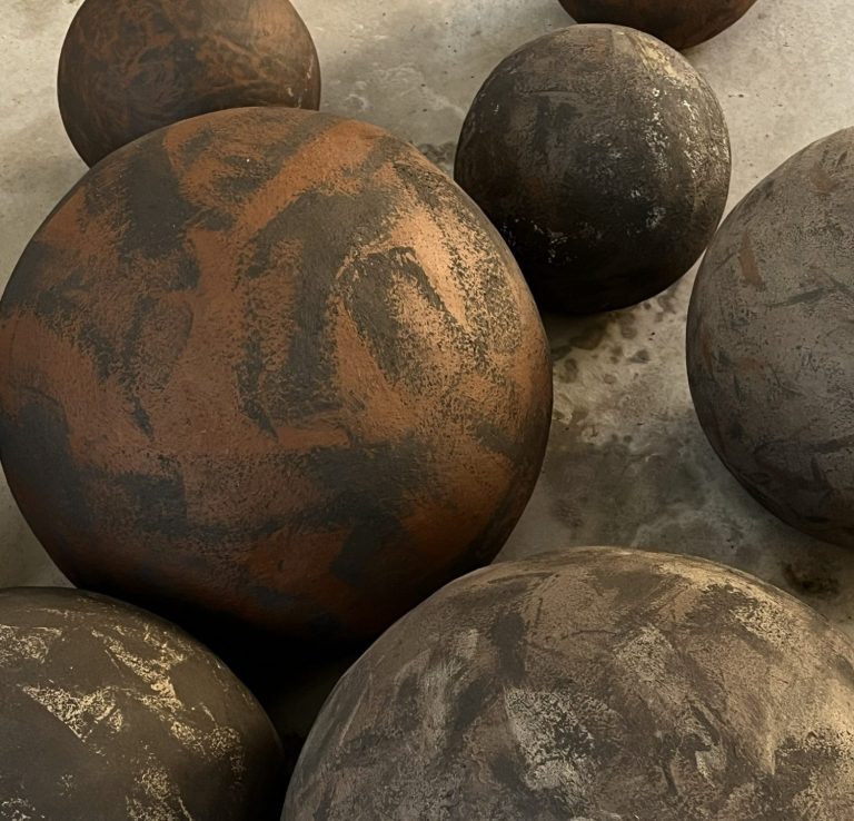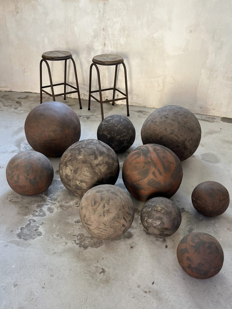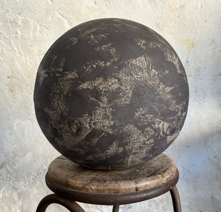 Ce travail sur les sphères telluriques, avec leurs formes primitives, leurs textures minérales, leurs craquelures, leurs accidents et leurs aspérités, s’inscrit dans le concept d’archéologie imaginaire que je développe dans ma pratique de la céramique. À travers la répétition du geste, l’usage de terres brutes, la superposition d’engobes et de cuissons, je construis ici des entités archaïques, intemporelles.