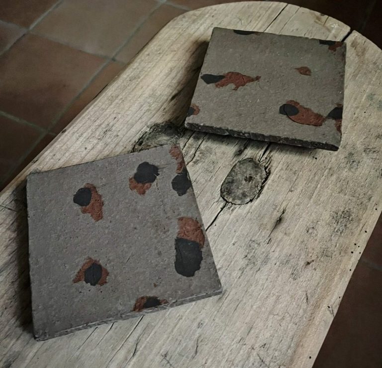 Les plaques de grès une fois décorées sont alors cuites en monocuisson pendant 16h à une température maximale de 1220 degrés et ce n'est qu'à l'ouverture du four que se révèlera l'œuvre finale.