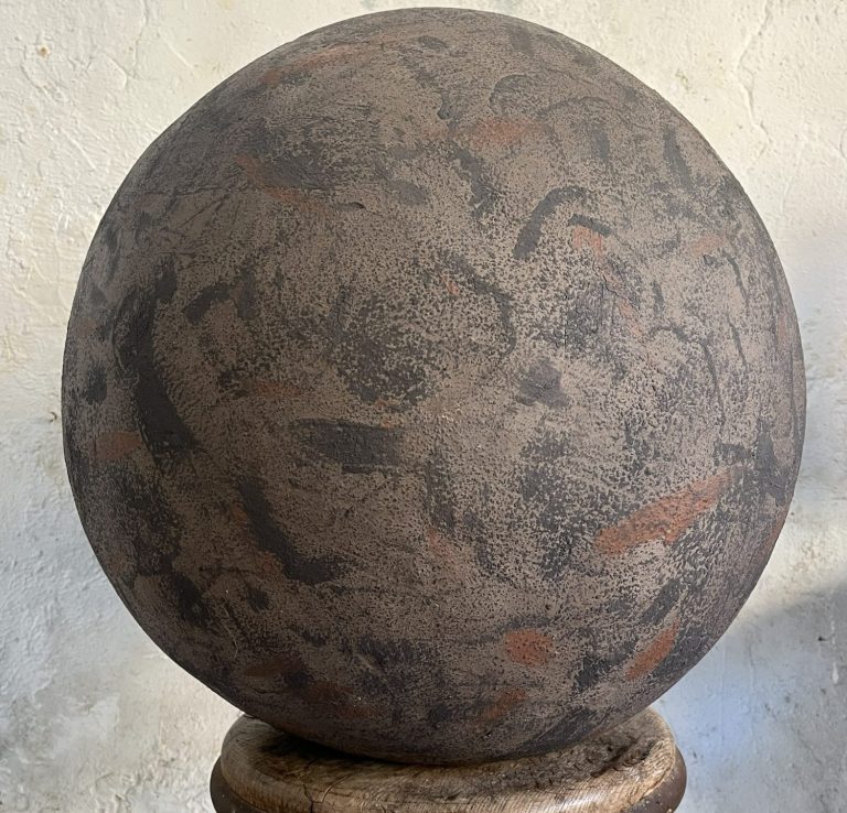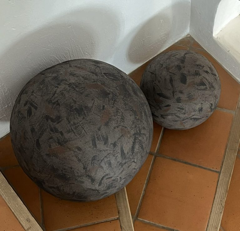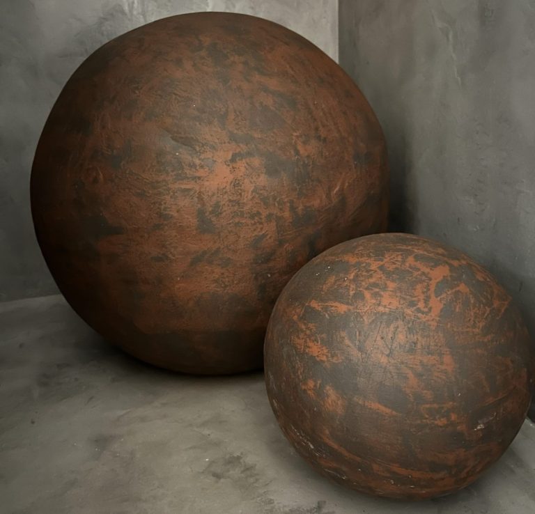 Je façonne ces sphères telluriques avec de légères déviations, asymétries ou marques, donnant l’illusion de traces d’un usage ancien, d’un rituel oublié. Massives et énigmatiques, leur immuabilité suscite paradoxalement une gravité, une attraction invisible invitant au toucher.
